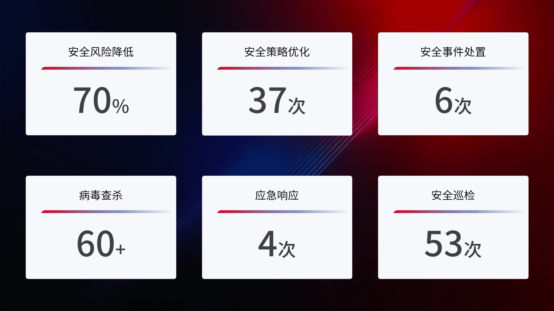 提供全面的安全事件报告体系,,包括处置报告、、周报、、、季度和年度总结,,,结合持续监控,,,,帮助客户深入了解网络安全状况。。。
